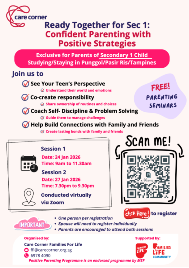 (b) As teens undergo the transition to adulthood, the emotional and physical changes they experience may overwhelm them. How can parents support them through these transitions?Care Corner will be conducting a talk on Supporting Our Teenagers Through Transitions.